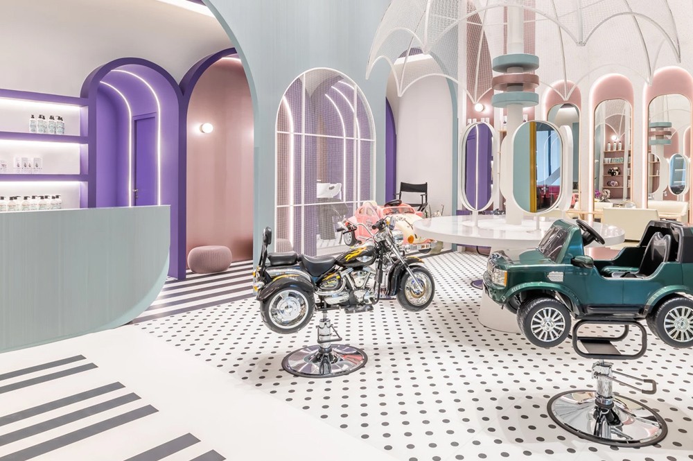 The creative concept of the children’s hair salon was a focus on fun and entertainment. The space needed to be exciting but not sacrifice the functionality of a hairdressing salon.