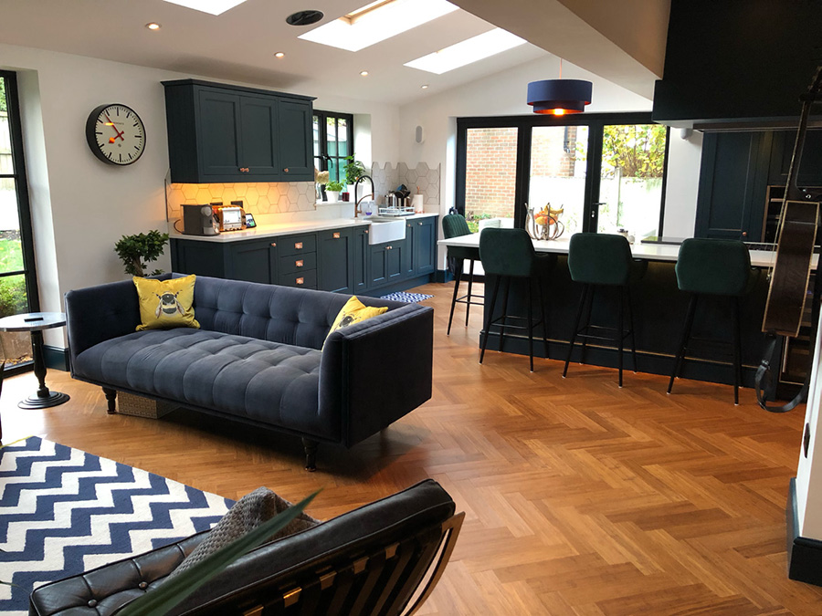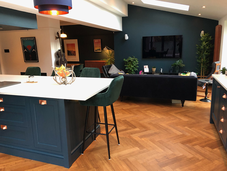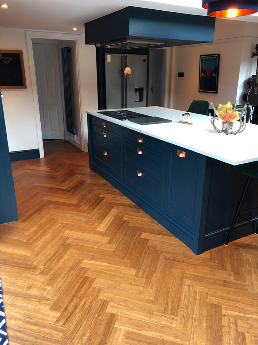 The actual flooring that Jake and Hayley chose was Solid Carbonised Strand Woven Parquet Block Bamboo Flooring. Parquet block flooring creates beautiful geometric patterns. Jake and Hayley have chosen to create the herringbone pattern throughout their open space. It really does give a feel of sophistication and elegance in this truly stunning extension area. Large windows and doors with the fresh white walls bring brightness into the boldly decorated and furnished space. We love the contrast of the carbonsied brown bamboo floor against the dark navy kitchen and furnishings. Jake and Hayley are “thrilled with the result and the quality. Everyone always comments about the floor.”