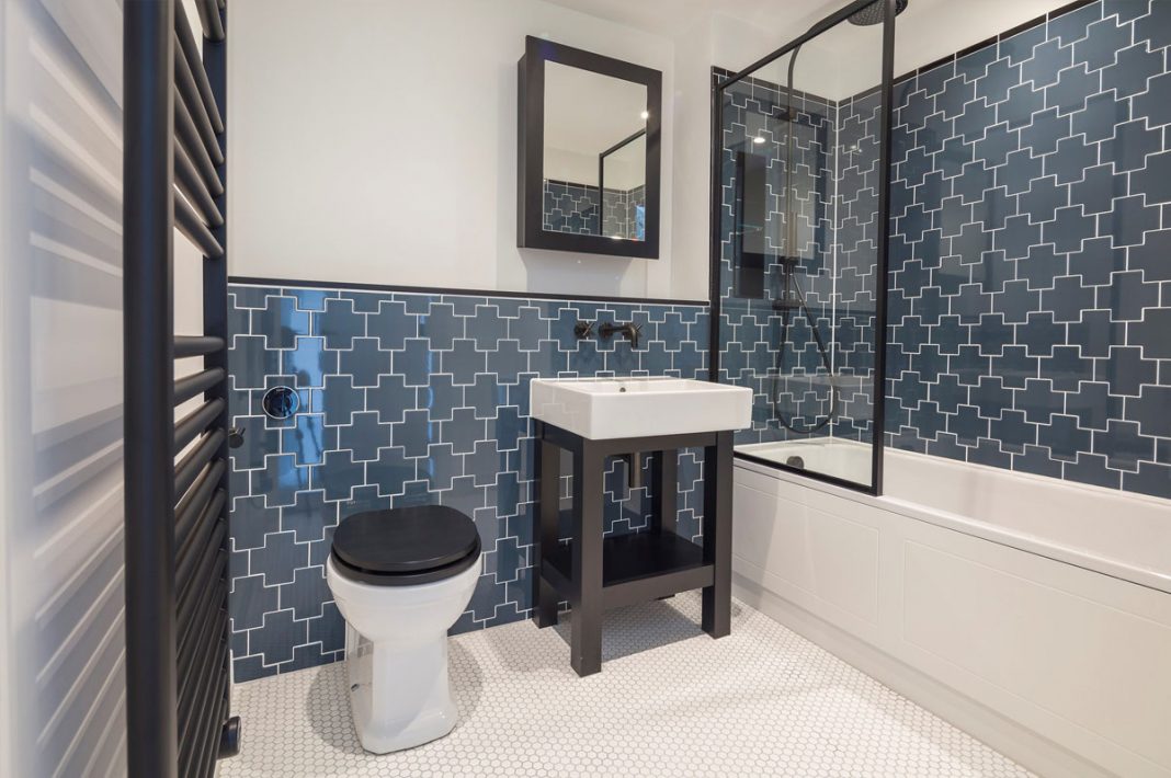 ‘We wanted to ensure the bathrooms and en suites referenced the original finishes of the Telephone Exchange building at the heart of Royal Exchange,’ says Jane Bartlett, St George. ‘Struggling to find what we needed in a standard range, we developed a bespoke tile with Parkside, creating a bold motif and a hand-crafted quality that references heritage. We’re thrilled with the final look – it has just the right nod to heritage, while still maintaining the smart and contemporary feel wanted by our purchasers.’