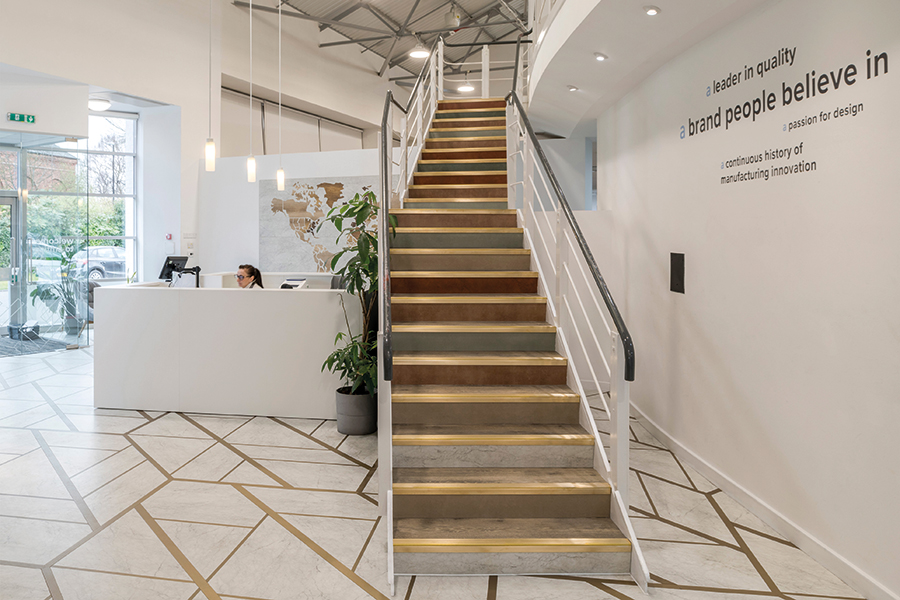 The head office, based in Coventry, welcomes clients and professionals from all aspects of the flooring industry and an attractive, hardwearing stair-edging was required for the central staircase.