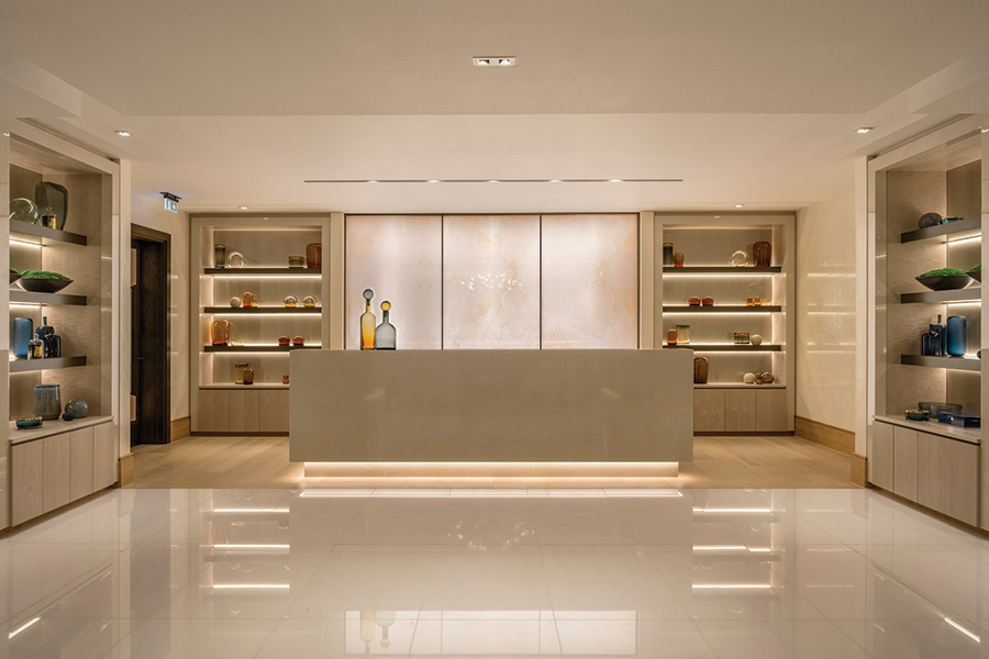 The company continues: ‘The dark palette option is a stunning brushed and deep fumed oak with a gentle lime through the grain (product code E153); it’s a prime grade oak with an allowance for colour variation to give a warmth while delivering on a luxurious modern aesthetic. The light colour option is a gently fumed prime grade oak (product code TW-E615). This floor captures the classic look of an established oak floor, slightly darker than unfinished (or raw) oak, but every bit as familiar. Again, you can’t help but feel like you’re in a carefully and thoughtfully designed space. It really is a testament to the interior designers.