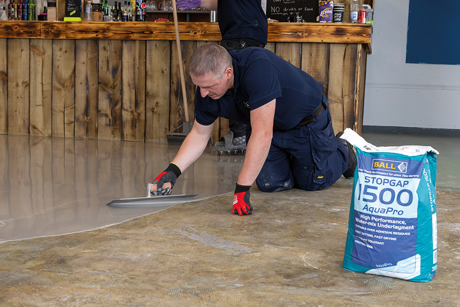 Says the company: ‘F Ball’s Stopgap 1500 smoothing compound was applied to create a perfectly smooth base for floorcoverings. Fast-setting and fast-drying, the product is walk-on hard in as little as 60 minutes after application and ready to receive floorcoverings from just four hours. Launched last year, Stopgap 1500 uses the latest cement technology to offer a water-mix smoothing compound that can be applied directly over old adhesive residues.’