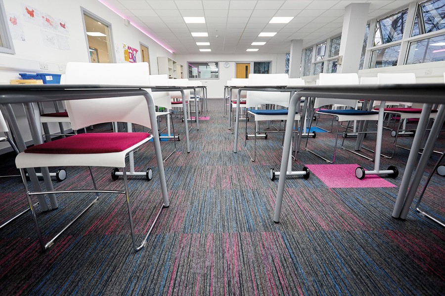 ‘The acrylic polymer emulsion adhesive can be used for securing a wide range of dimensionally stable ‘flat-lay’ carpet tiles backed with bitumen/felt, non-woven fabric, PVC, and other polymer backings. Before installing the floorcovering, contractors determined a moisture management solution wouldn’t be required for the concrete subfloor in the sixth form space, as a moisture test indicated the base was sufficiently dry, and so proceeded to the application of a levelling compound and the subsequent carpet tile installation.’