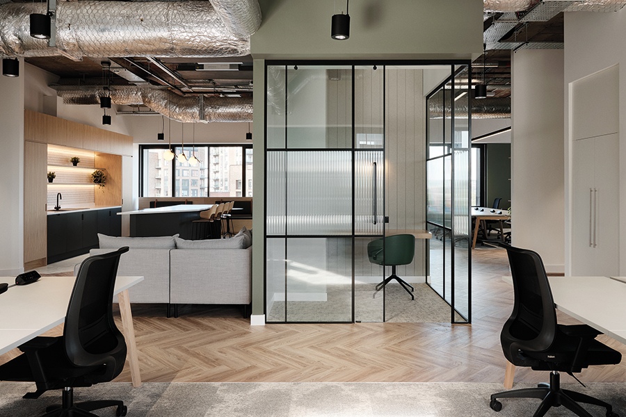 Typically, carpet tiles or exposed raised access flooring are said to be the go-to solution in these scenarios, however with a premium design required, Oktra opted for something different, as Danielle La Porte, designer at Oktra explains: ‘Akoya wanted to create a range of category A office suites that would be memorable to tenants, while also meeting sustainability requirements. With this brief in mind, we specified Forbo’s Allura Flex LVT, which is available in range of colourways and wood effect designs – perfect for this project.