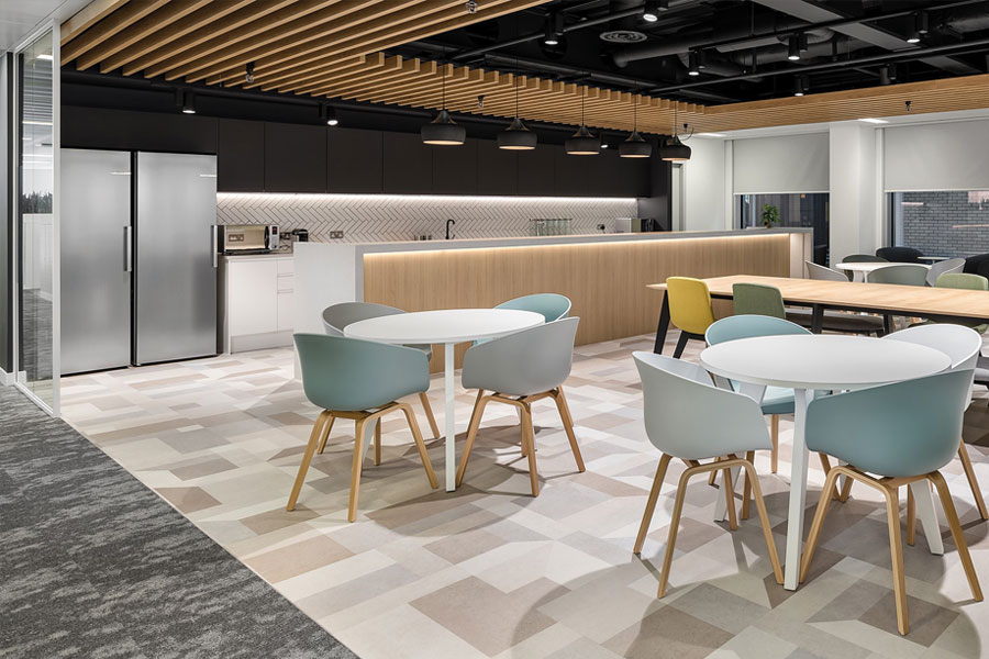 In the breakout, Oktra’s Steffi Diola, opted for Moduleo 55 Expressive Jumble Stone: ‘The subtle colours and bold pattern of IVC Commercial’s Jumble Stone add a bit of fun to the breakout but still delivers the high-level sophistication seen throughout the floor,’ explains Steffi.