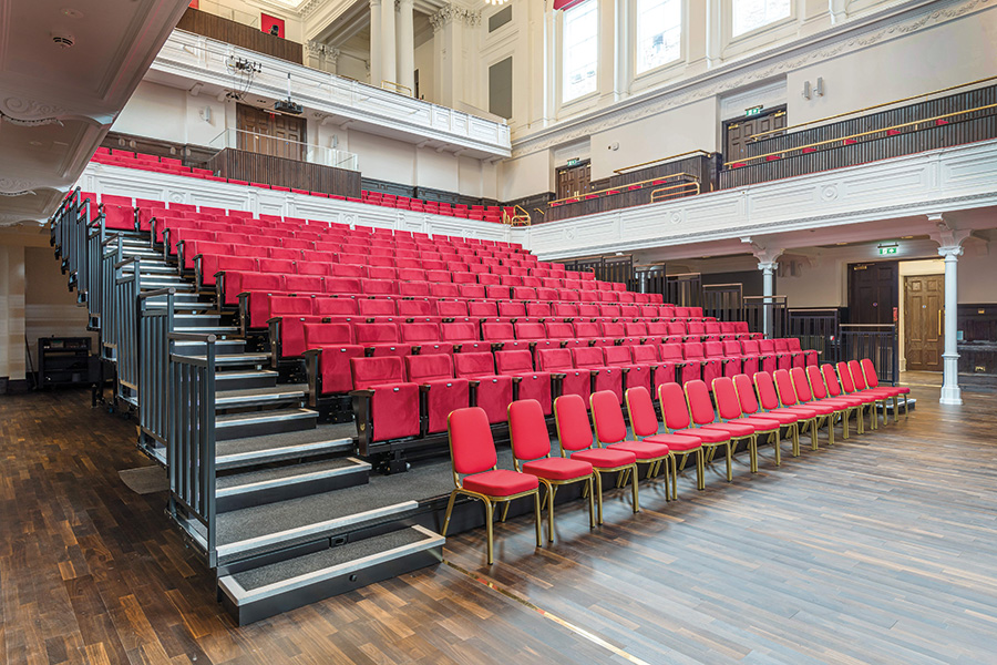 Junckers’ flooring was installed in several areas, including the main auditorium where the stage was entirely rebuilt to incorporate a rise-and-fall functionality, says the company. It adds: ‘To introduce more flexibility to the space, the ground floor seating was replaced by a retractable system. The hard-wearing surface of a Junckers’ pre-finished solid hardwood floor is resistant to the wear and tear associated with a retractable system and the sprung quality of the flooring system will remain intact.’