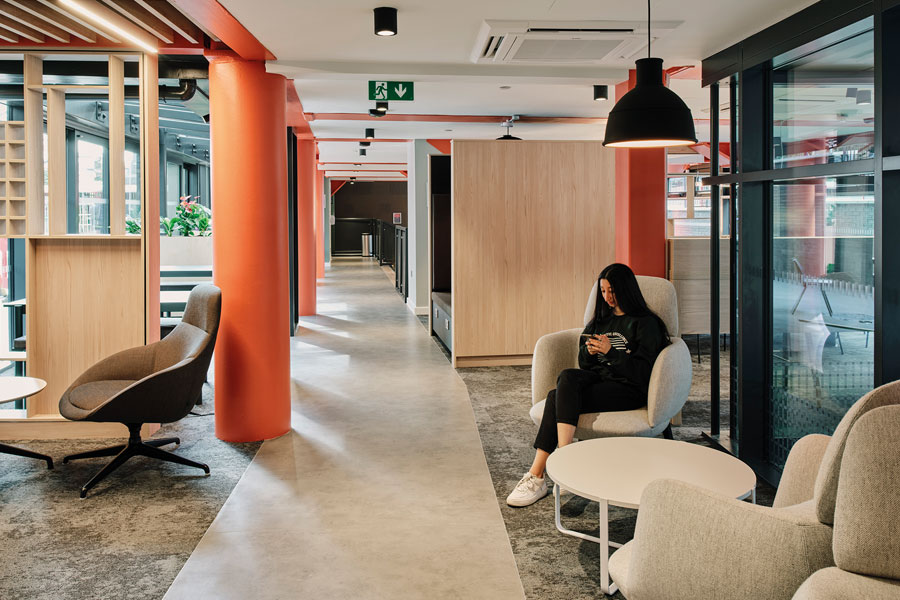 With various activity zones, Forbo Flooring Systems’ Tessera Cloudscape carpet tiles and Sarlon acoustic sheet vinyl were specified, reportedly helping to create a fully integrated and striking space that meets the demands of modern student living. The Refinery was a winning project in the Fly Forbo 2020/21 competition.