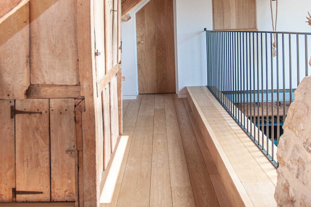 For these 4 individual suites set within an old coach house building, Chaunceys worked hand in hand with main contractors Ken Biggs and Studio Mark Ruthven Architects with some impressive results. The staircase was built from 40mm solid square-nosed oak, with a cross sawn and brushed finish and an invisible lacquer, to exactly match the flooring throughout. The boards were fitted with a small shadow gap between the boards to give a more authentic and rustic feel.
