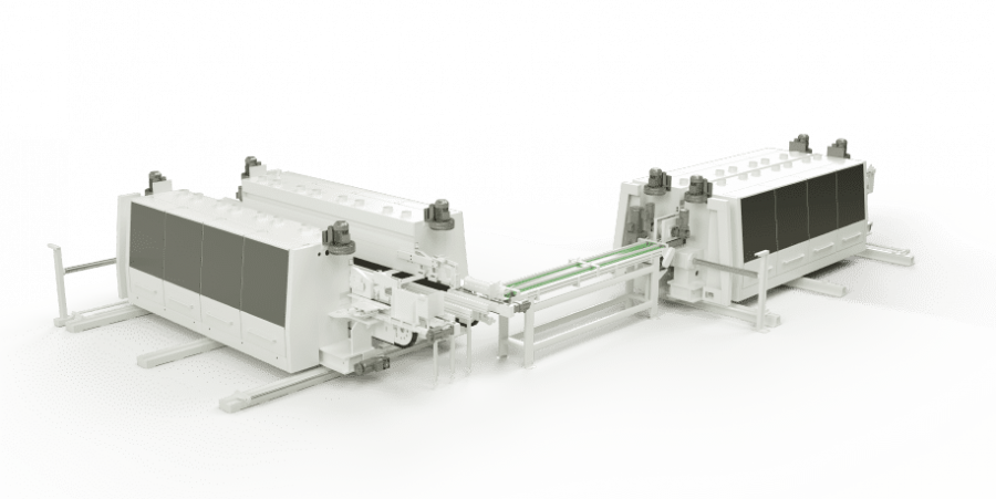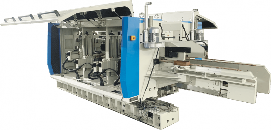 Angle double end tenoner, through the double end tenoner principle of fishbone floor transverse end slotting. Can SPC floor, engineered floor, laminate floor and other materials for custom processing.