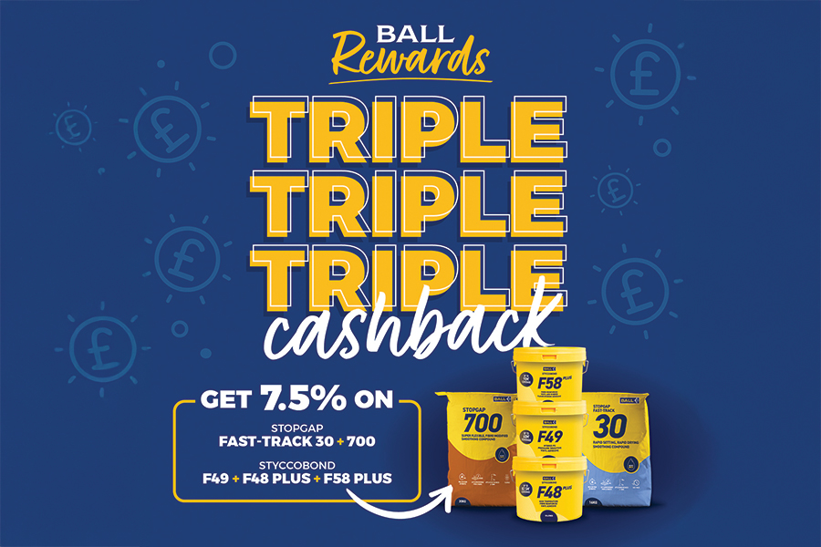 In the current promotion, which runs until the end of March, Ball Rewards members can claim triple cashback (7.5%) on purchases of F. Ball’s Stopgap 700 and Fast-Track 30 smoothing compounds, as well as Styccobond F48 PLUS, F49 and F58 PLUS adhesives. This is in addition to the regular 2.5% cashback on purchases of all other F. Ball products.