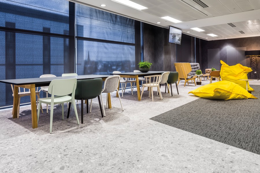 With a design that draws inspiration from EY’s brand, Wellwood Leslie created a floorplan that reflects the angles of the company’s logo and which gives the open-plan space multiple layers, simultaneously identifying areas. Mixing between LVTs installed on Flex Pro underlay and carpet tiles has also helped improve acoustics within the space.