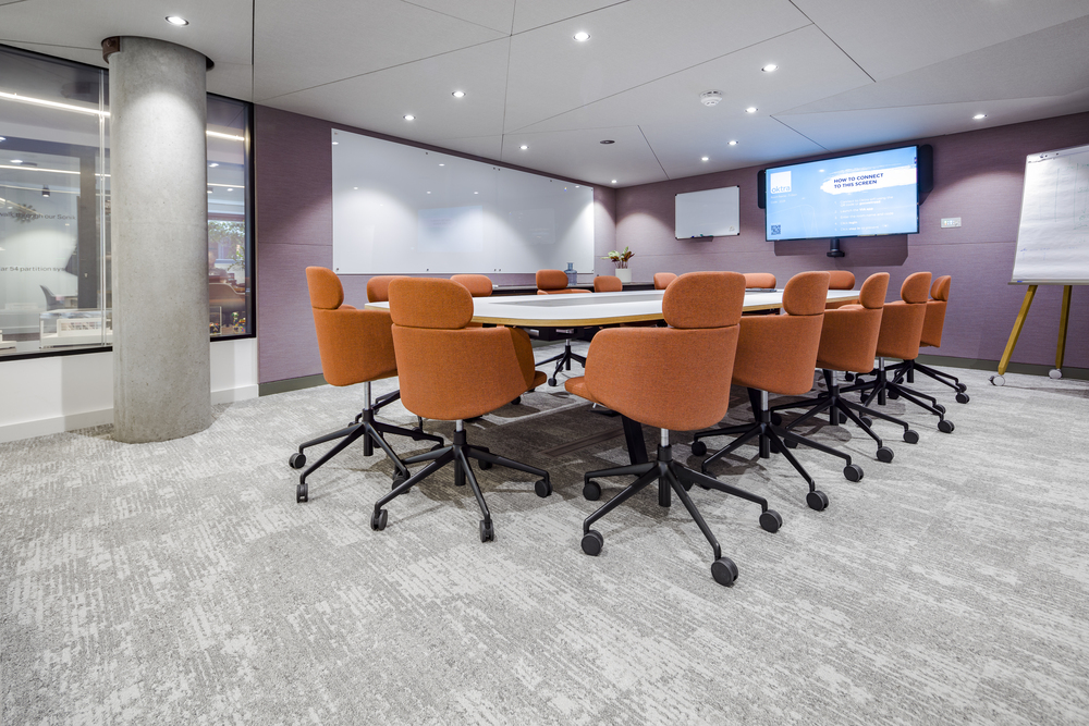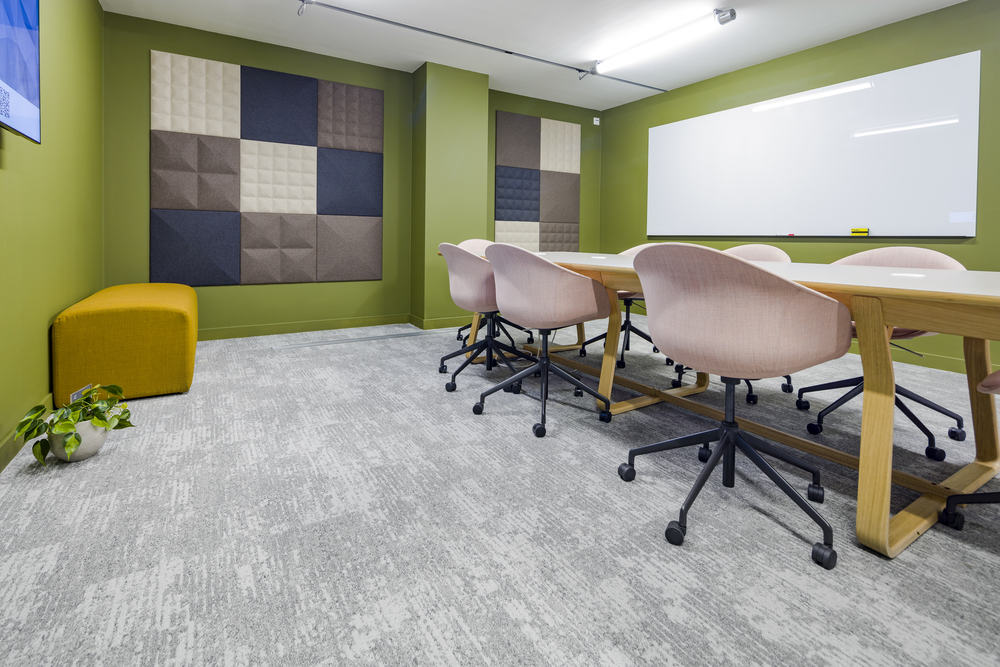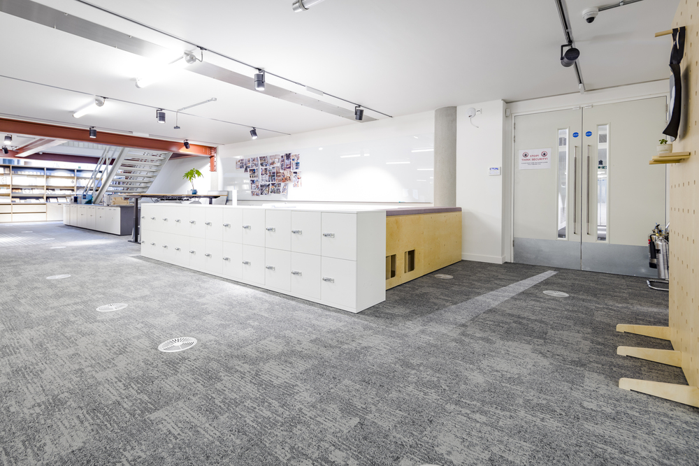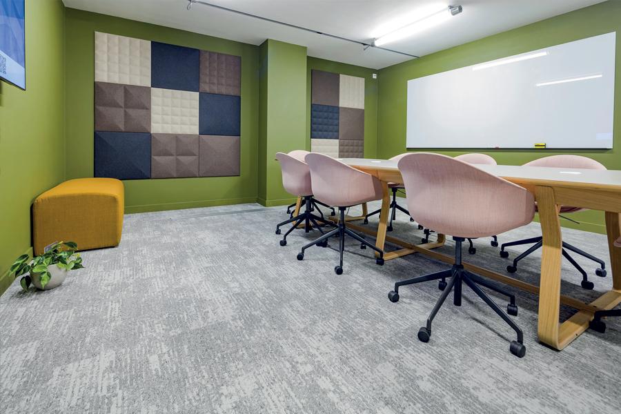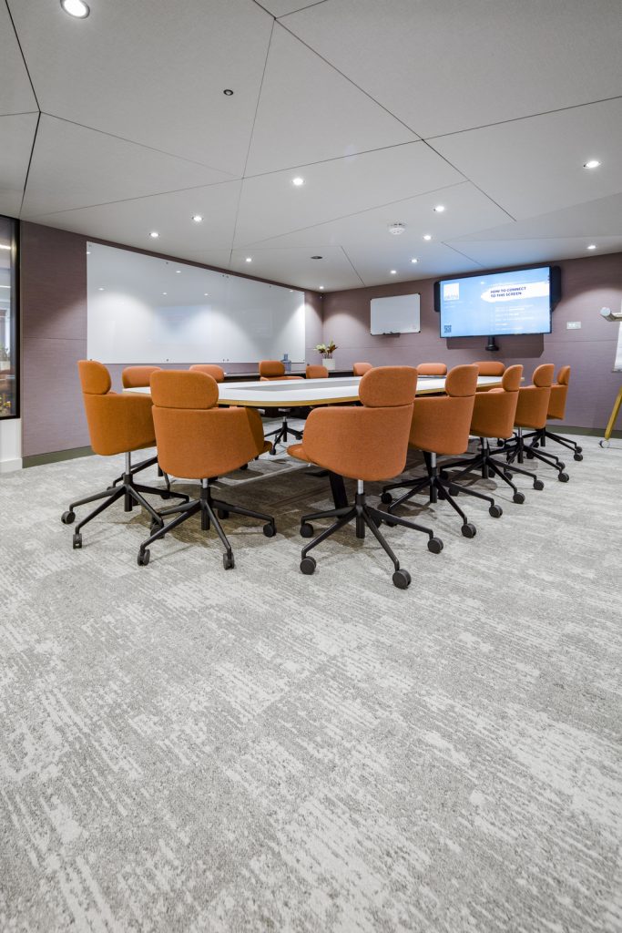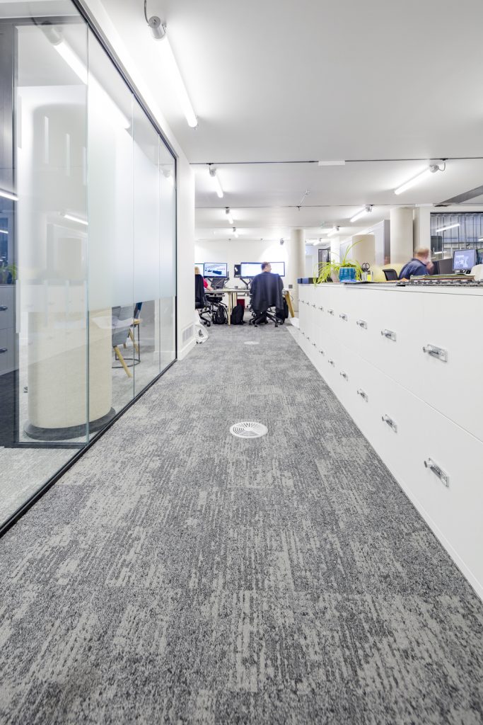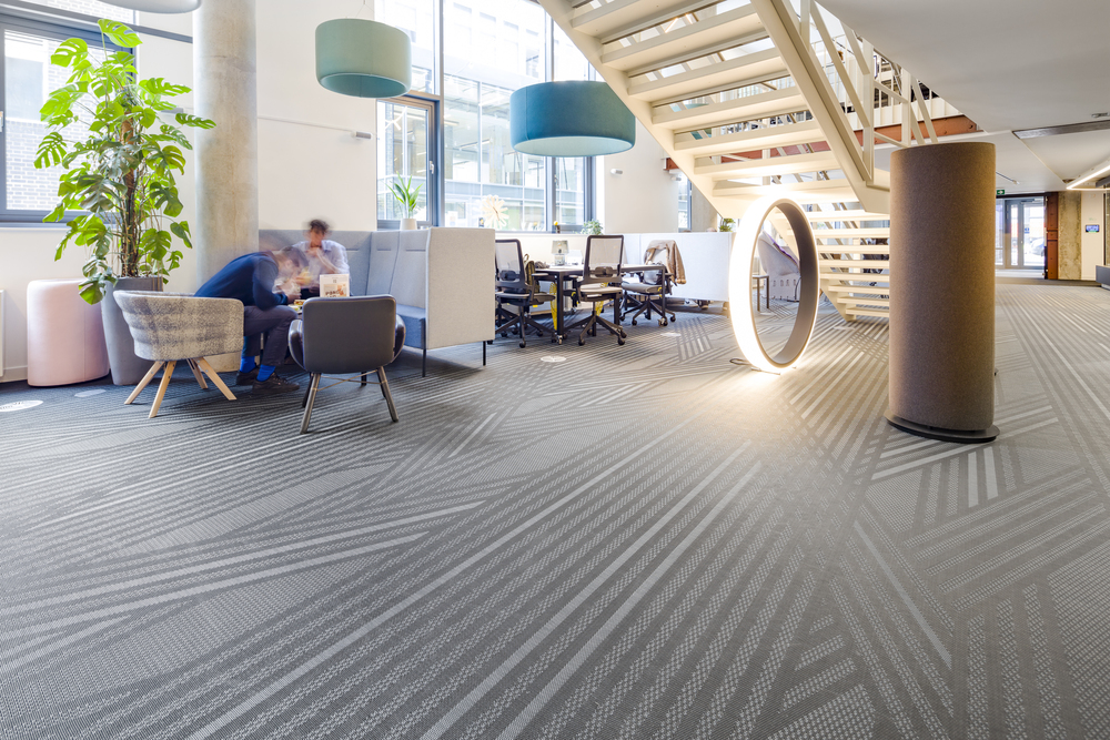 Dominic Dugan selected two colourways of Bruut, using the mid-grey of 911 and the lighter 959 to donate areas of activity and provide navigation through the ground floor basement area. A total of 595sq m of carpet planks were installed by Oktra’s own fit-out team.