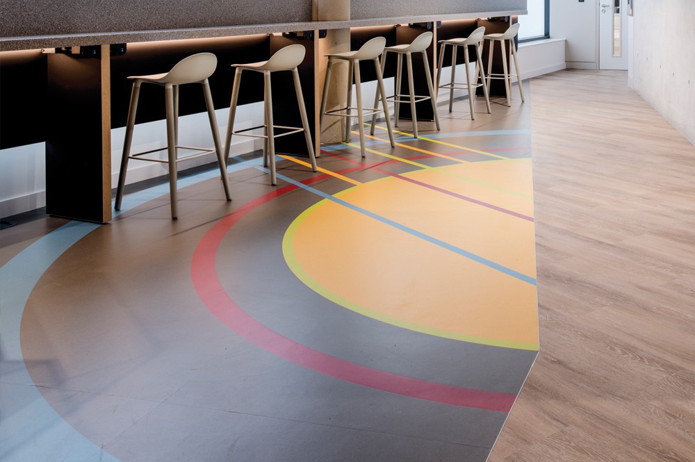 Continues the company: ‘noraplan sentica was selected as the high-quality natural and industrial rubber makes the flooring extremely hardwearing, slip resistant and easy to clean, supporting the hygiene considerations for the space, as well absorbing sound, crucial for such open plan spaces. The designers opted for a selection of bold grey, pink, blue, green, yellow, and orange shades, and incorporated a striped pattern to add interest.’