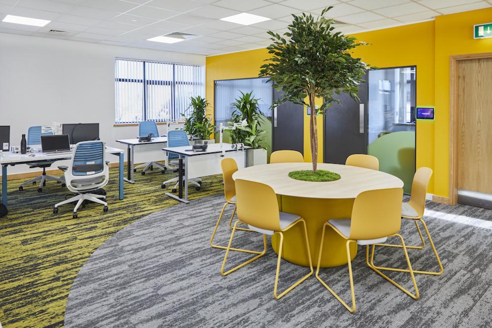 In the main desking areas, Art Style and Art Fields carpet planks have been installed in a range of colours that reflect Plastribution’s colourful and vibrant brand identity. Bright tones of yellow, cyan and magenta have been contrasted with circles of charcoal grey for a look that is energetic yet professional.