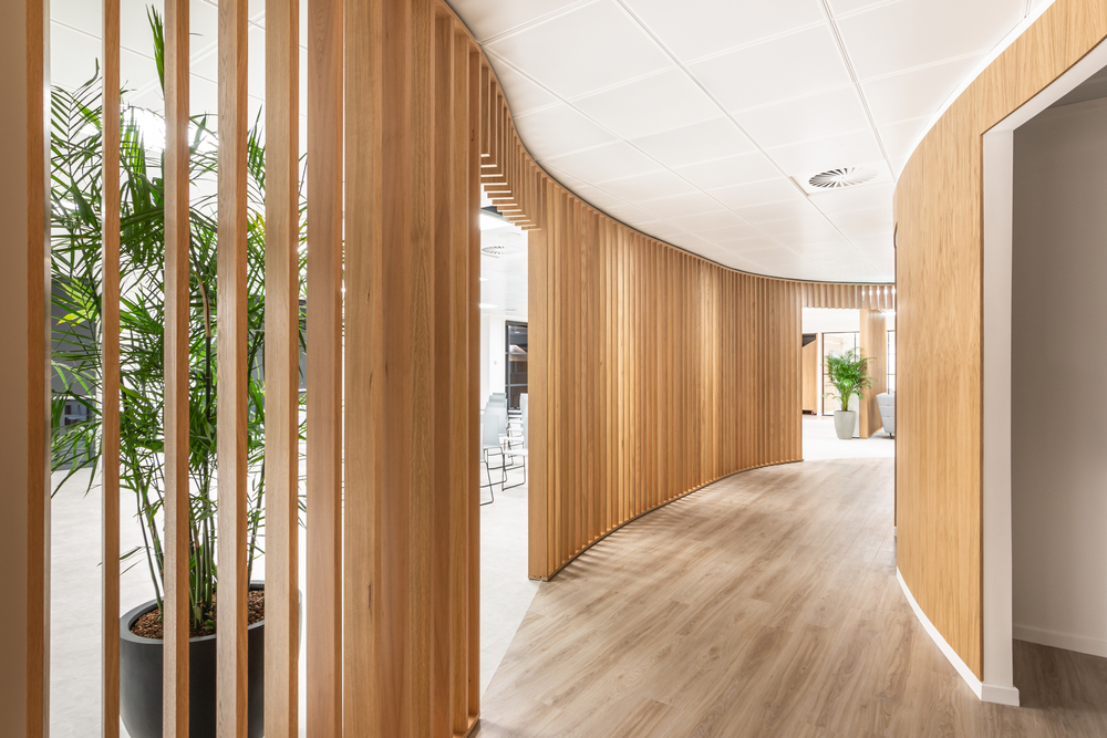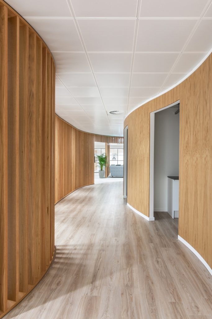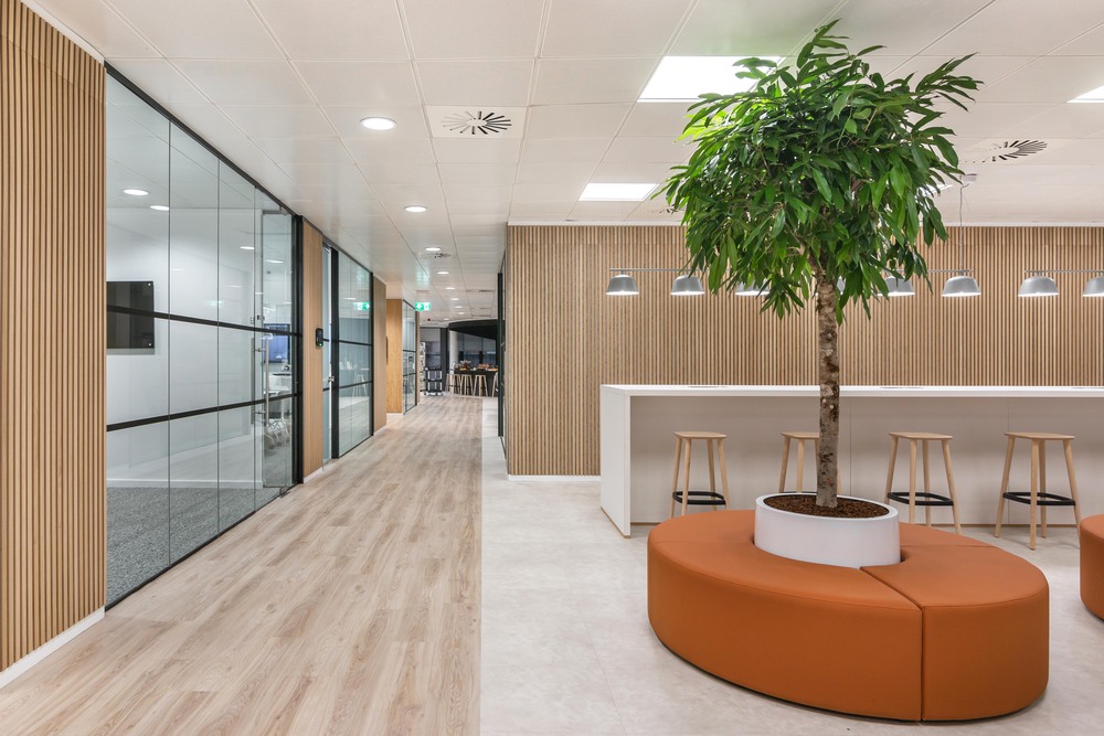 Wellwood Leslie selected the warm and characterful wood of Blackjack Oak, contrasting it with the sleek modern tile of Ceramic across the open plan space. Aiding navigation and defining areas, thanks to the use of IVC Commercial’s Luxury Vinyl Tiles the mixed material layout has transitions without metal profiles for an elegance that is not obtainable with original materials.