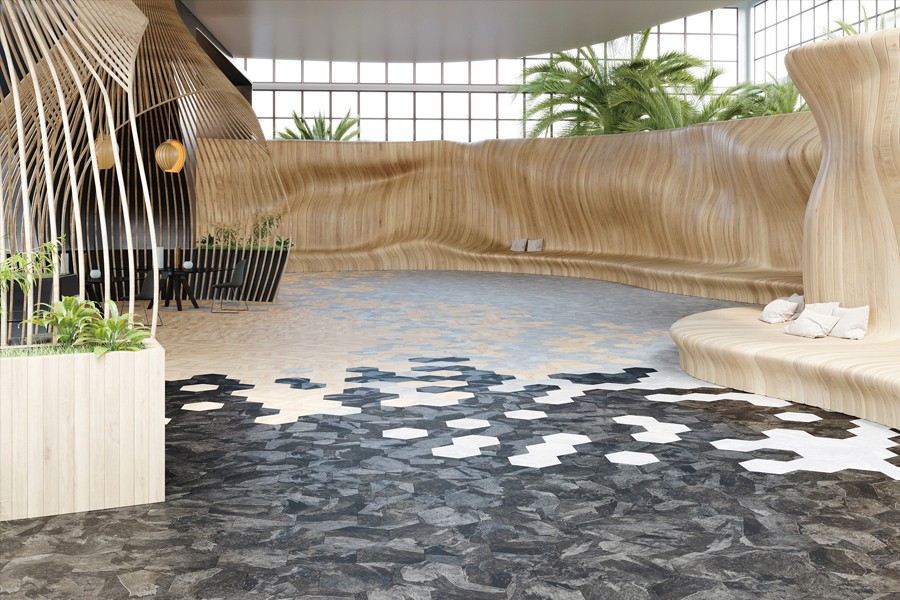 IVC Commercial’s Studio Moods is a vinyl floor that’s available in various precision-cut geometric shapes and a range of wood, stone, material, and colour effects. It allows designers to create a custom floor design easily and affordably.