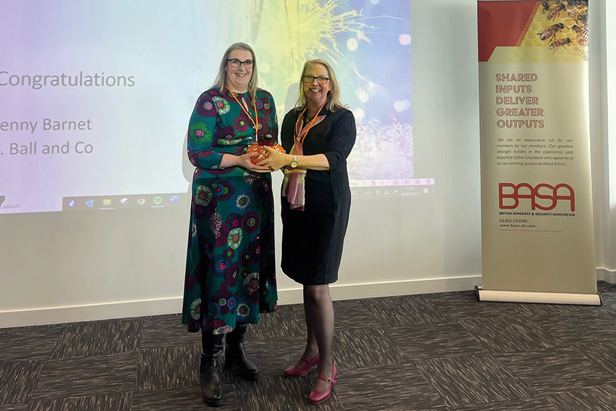 F BALL and Co’s safety, health, environment and quality assurance (SHEQ) manager Jenny Barnett has been recognised for services to the adhesives and sealants industry, receiving the Max Kochmann Award from the British Adhesives & Sealants Association (BASA).