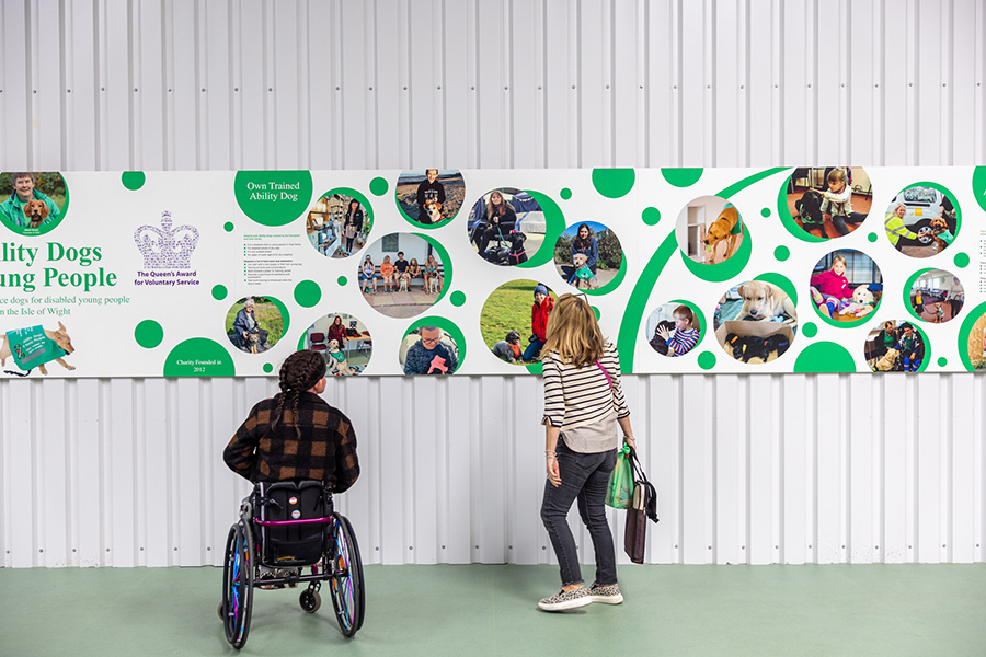 ‘Thank you for the fantastic display board’ said Carol Court, founder and ceo of Ability Dogs 4 Young People IoW. ‘The wall gives a welcoming and friendly feel to the space and will be a real asset for our training centre. The wall panels have provided a stunning background to a very large space, and we are delighted with the outcome.’