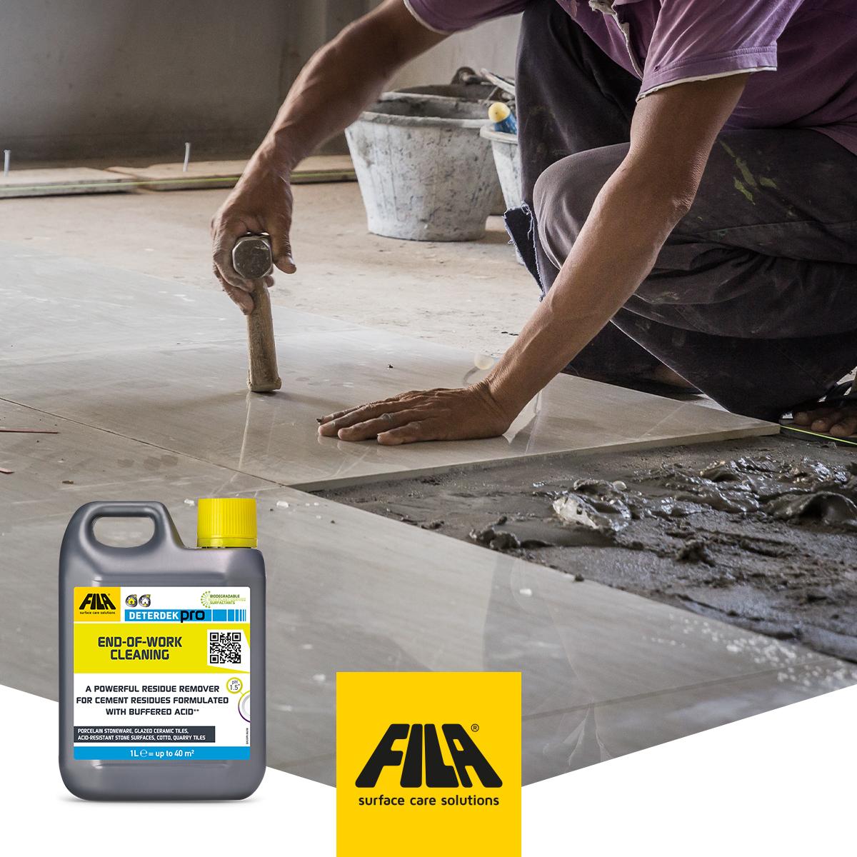 First and foremost, it always starts with the prep. So be sure to work out the type of material you are working with. For example, you can’t use a concentrated acid detergent on acid-sensitive stone, but you can use this cleaner on surfaces like porcelain tiles, terracotta and Brazilian slate. You should also clean the tiles as soon as you can to make subsequent cleaning and treatments easy. Don’t put off what you can do today until tomorrow. It’s also quick when you have FILA’s DETERDEK PRO.