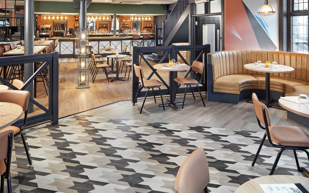 For the ultimate expression of bespoke design, LVT can be hand-cut into any shape. This truly unique result can be seen in some of Karndean’s most popular case studies such as Stirr Ups Bar and Restaurant in Evesham, which included a ‘houndstooth’ design in its restaurant area to give each table its own defined dining space, or at Charlton Hall in Northumberland which features an unusual monochrome art deco floor design.