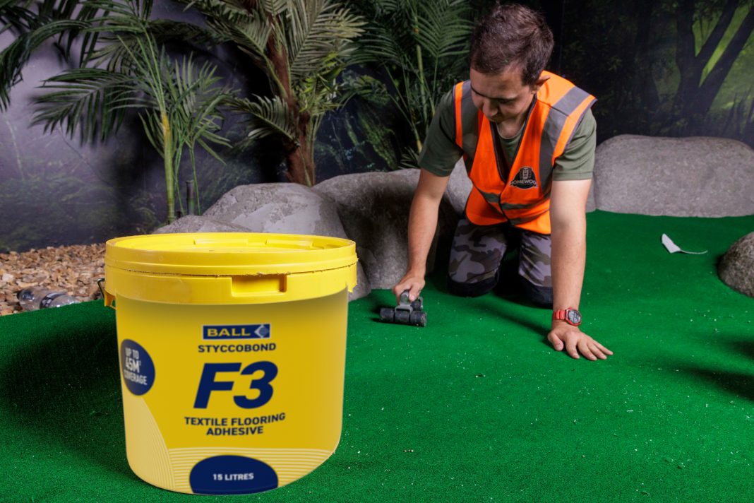 F. Ball and Co. Ltd.’s Styccobond F3 has been used to install Premium Putt artificial grass carpet on and around obstacles of two indoor 18-hole crazy golf courses at one of Europe’s largest crazy golf centres, involving painstaking care and attention to detail to create smooth and seamless surfaces.