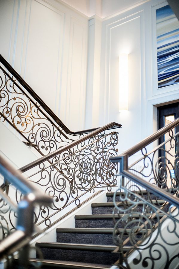 Morleys stair nosings look perfectly at home in the luxury hotel and match the rest of the décor. Our range of premium finishes allowed Seamill Hydro to implement a safety feature on the staircase without compromising on style. Both staircases beautifully bookend the entrance to the hugely popular Firth Pavilion, creating a majestic backdrop and ideal photo opportunity for wedding guests.