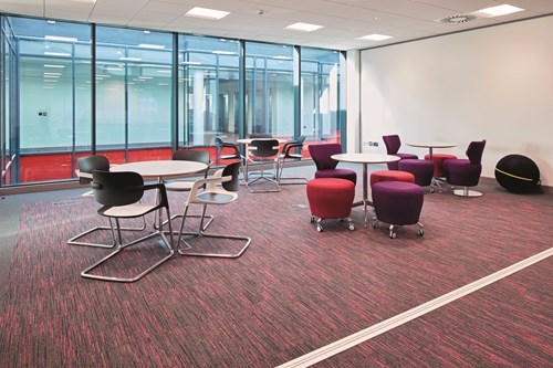 Finally, colourways had to mix and correspond with carpet tiles left in the original design as part of the repurposing program therefore Paragon’s 300+ colourbank was said to be used to great effect. For this reason, Strobe, Diversity, Codec and Toccarre products proved to be ‘exceptional choices with dramatic results’, Paragon claims, created by mixing the ranges creating demarcation zones, breakout areas and wayfinding links within rooms.