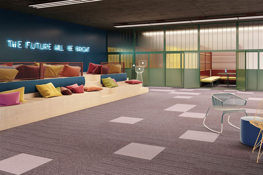 ‘All 32 colours are available in the solid carpet tile of Creative Spark with the duo-tone pinstripe of Expansion Point available in 12 coordinated colourways. Then rounding out the collection, Blurred Edge brings a sophisticated duo-tone linear effect in 10 combinations rooted in earthy organics. By combining Creative Spark, Expansion Point and Blurred Edge, designers can create dynamic floor layouts that respond to zoning and route finding, while benefitting from a carpet tile that provides excellent value.’