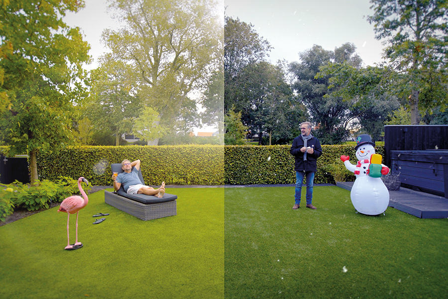 Says Condor: ‘Artificial grass with Colorshift technology changes colour based on heat. The outdoor temperature affects the shade of the product to match the current season. At temperatures up to 15deg C, Colorshift maintains a dark green appearance. The colour gradually transitions to light green between 15-30deg C.