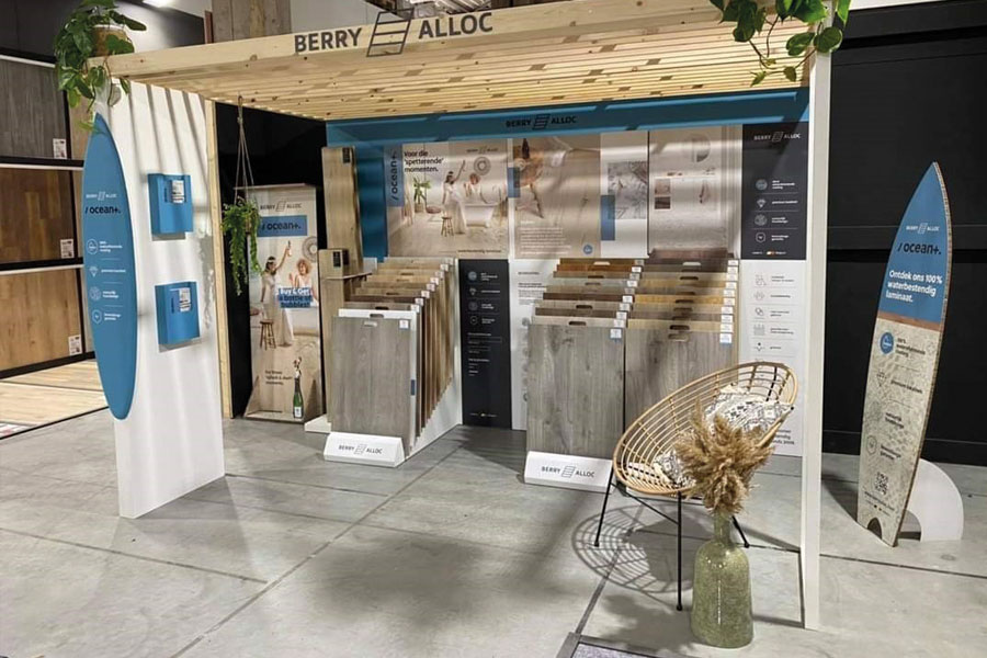 Centred around three toaster racks that display the collection’s 30 decors, as well as an additional module that shows the two plank sizes and thickness, the Ocean+ Beach House is described by the company as an impressive pagoda-style lit structure that comes with a range of additional features. From a surfboard carrying the collection’s main USPs, to a comfy lounge chair, vases with dried flowers and plants, everything is included to create a laidback summer vibe all-year round, says BerryAlloc.