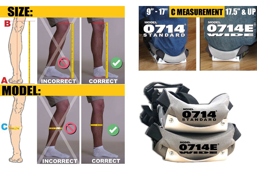 3. Measure around the widest part of your calf muscle with work pants on. The kneepad model (0714 Standard vs. 0714E Wide) is related to your knee width and determined by the C measurement. A measurement of 17.5in or larger defaults to a Model 0714E Wide. In some rare cases, a person may have a wider calf, but narrow knee width and will require our Standard model. This is why it’s important to try on your pads to ensure you have the correct size and width before putting them to work.
