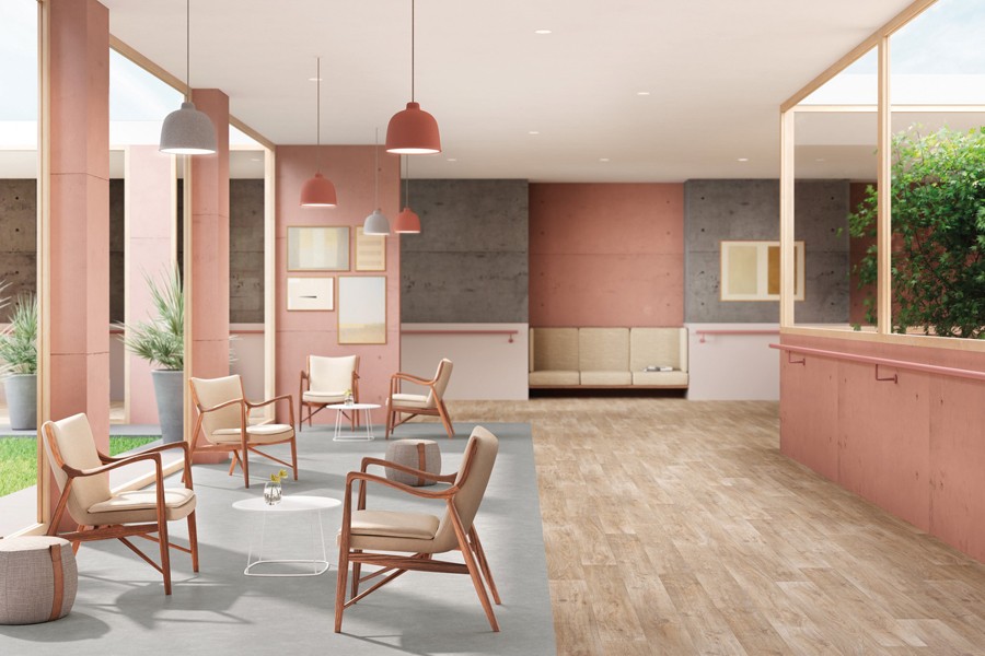 Continues the company: ‘In authentic wood, concrete and terrazzo floor finishes, Tempo features a varied structure, crystal clear print, a super matt finish and sharp v-grooves to add definition. The look is impressively authentic and certainly raises the bar for sheet vinyl flooring. The result is a great looking floor that provides projects with a seamless solution that has excellent wear-resistance and ease of cleaning.