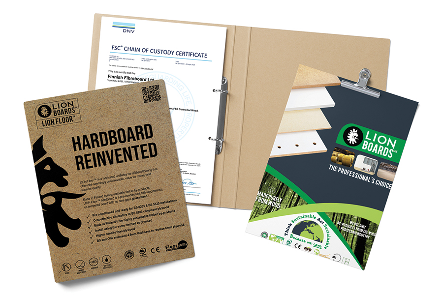 ‘LION Floor also comes with a third-party verified EPD that demonstrates its use is also a sign of a more sustainable installation. This means every project which chooses LION Floor can now benefit from a fabricated hardboard underlay that’s proven its environmental performance in line with international standards (ISO 14025). The EPD looks at the cradle to gate lifecycle of LION Boards and sees a global warming potential figure far below European made particleboard and plywood.’