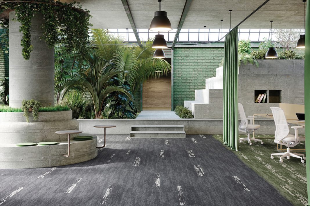 ‘Clay, Clay Create, and new Metallic Clay are random lay carpet planks inspired by mankind’s crafting of clay, first hand-shaped into the rudimentary building blocks that have protected us for centuries. Adding organic structure to Rudiments projects and part of more than 100 carpet tiles with a shared yarn bank, they bring new ways to mix and match across spaces.’
