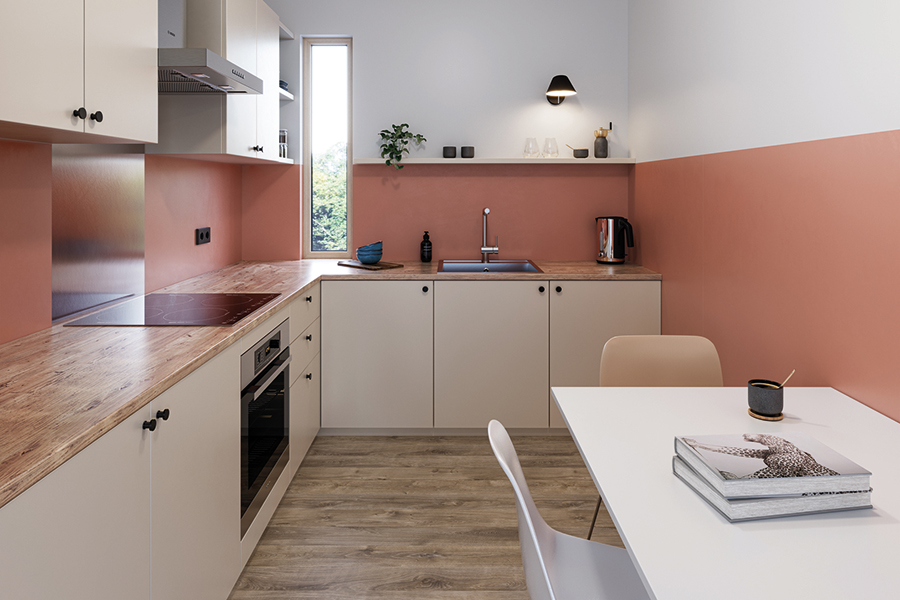 Continues Altro: ‘This versatile and sophisticated wall cladding is available in a range of solid, decorative, shades – from new soothing Spa and healing Hessian, through to fresh Flint and original, organic Orchard, which matches Watercress, one of Pantones’ top 10 standout colours for 2024, bringing ‘a refreshing peppery green with a sprightly presence’.