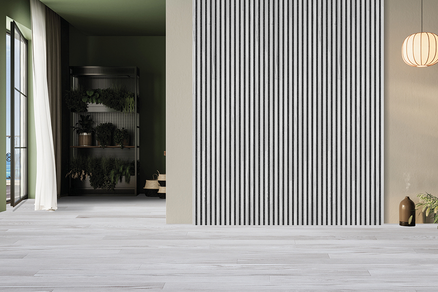 ‘With digitally printed wood fibre slats that are designed to exactly match the look of the flooring, a harmonious unit can be created for any interior.’