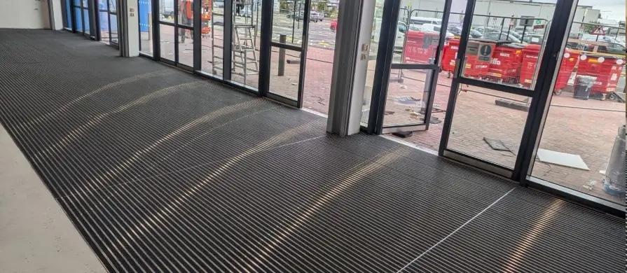 The Belgravia Entrance Matting System looks fantastic in the Knowsley Fulfilment Centre. Because the matting area is very wide, the mats had to be fitted in a few pieces, with separate matwells for each part. Quantum’s technicians did this in such a way that it looks like one continuous system.