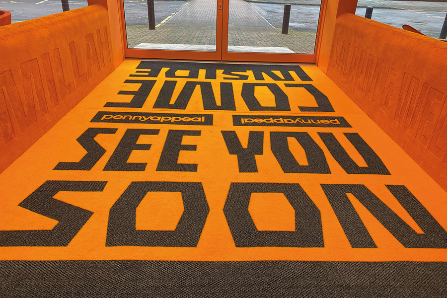 Says the company: ‘Here at the penny appeal campus in Wakefield Rawsons non-direction entrance mat called ‘Cobble’ has been used to great effect with a bright contract colour in orange.