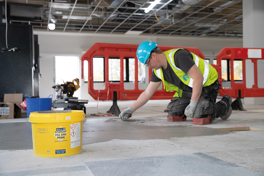 Recently developed cement-based primers, such as F Ball’s Stopgap Fill and Prime, are available that are designed specifically for use over raised access panels, which fill the gaps at the joints between the panels while priming the subfloor, saving valuable time. These cement-based primers have a thixotropic consistency, meaning they flow freely when stirred but set to a gel-like consistency on standing.