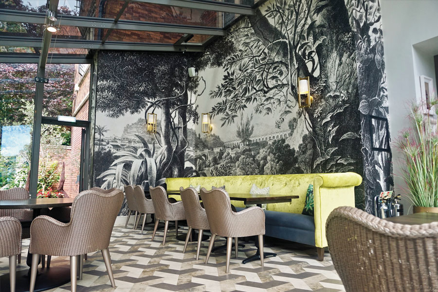 ‘Moxhull Hall Hotel is a great example of this with its dramatic floor design that looks equally amazing at any time of the day or night. The geometric tiles from our Kaleidoscope collection have been laid in subtle tones of grey to cleverly coordinate with the monochrome wall mural, adding interest without competing for attention.’