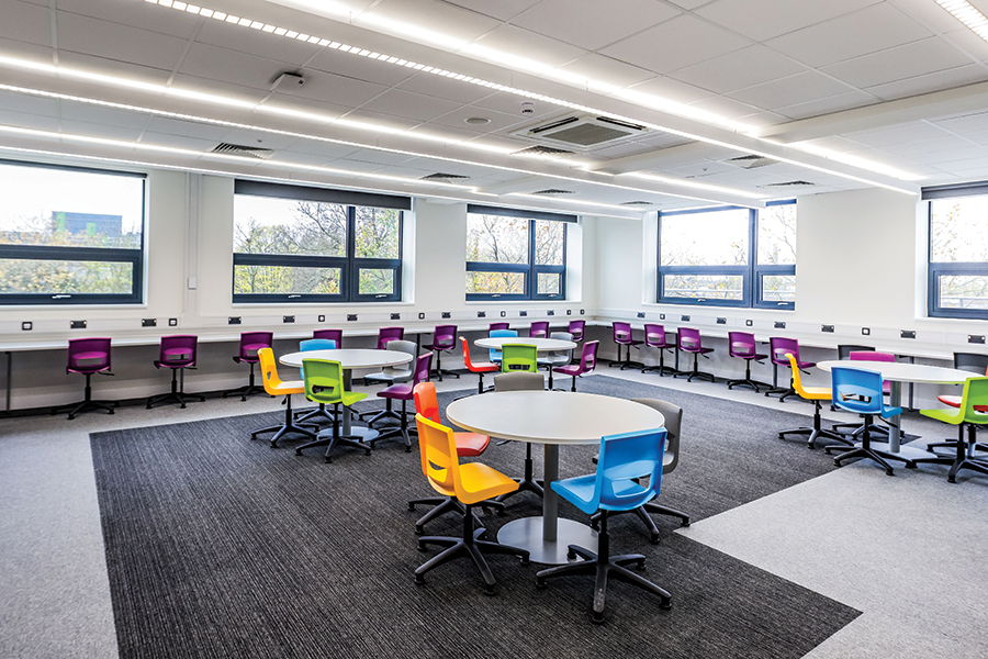 Facilities include science laboratories, a library, sports hall, main hall and sixth form common room, while the roof of the sixth-form block also houses a multiuse games area (MUGA). Rooftop solar panels contribute to the school’s green energy and the entrance is marked by a majestic weeping willow tree, around which the school layout was designed.