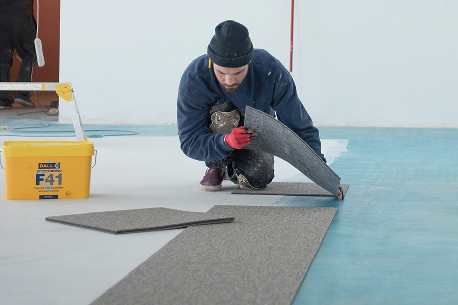 ‘Installing carpet tiles using a carpet tile tackifier, such as F Ball’s Styccobond F41, ensures that carpet tiles are held firmly in place when subject to lateral movements, such as everyday foot traffic and equipment being wheeled around, while allowing them to be easily lifted vertically if they need to be replaced at a later date. The adhesive is solvent free and, as testament to its ultra-low VOC emissions, certified EMICODE EC1 Plus.’