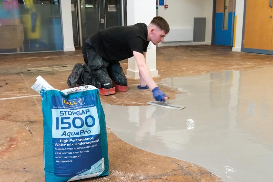 Says F Ball: ‘Stopgap 1500 AquaPro uses the latest technology to offer a water-mix smoothing underlayment that can be applied over old adhesive residues, including bitumen, carpet tile tackifiers and ceramic tile adhesives. In such applications, there’s no need to prime beforehand, saving further time and expense. Fast-setting and fast-drying, it’s walk-on hard in as little as 60 minutes after application and ready to receive floorcoverings from just four hours.’