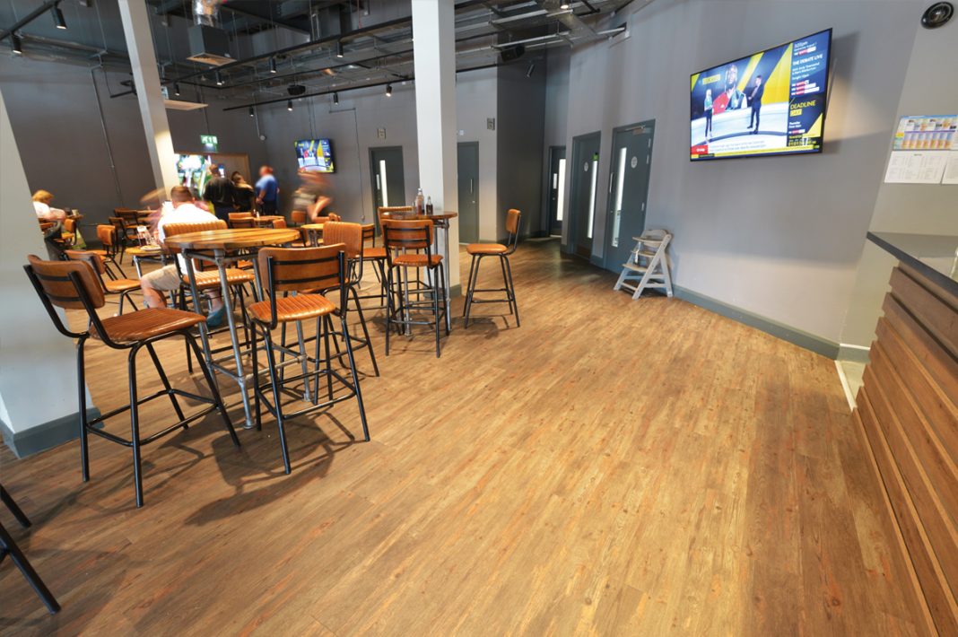 Polyflor Expona wood-effect vinyl planks were installed in the sports bar. Polyflor Expona Endgrain vinyl planks, which create the appearance of wood blocks, were used in the areas in front of the bars in the eatery, private members bar, and function room.