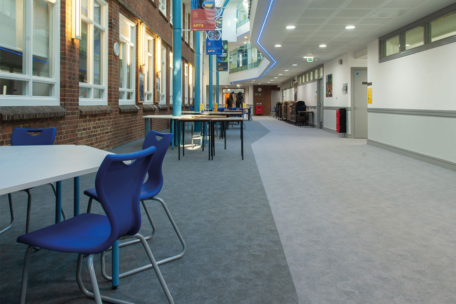 Starting in the sixth form areas, contractors from Teddington Carpet Centre made a feature of the long and narrow atrium by mirroring the footprint of the mezzanine floor overlooking the breakout area onto the floor below, using a 50/50-split of Calgary Cement and Grey Forbo Flotex carpets.