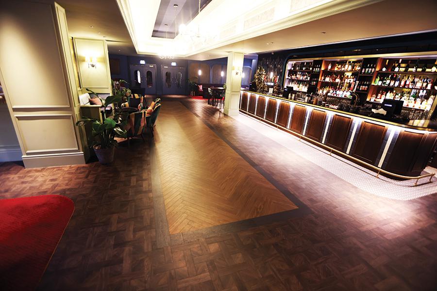 Amtico Signature basketweave, wood-effect LVTs were installed in the Late Lounge Bar up to seating areas with bespoke Newhay carpet and ceramic tiles around the bar, as well as on the steps leading to the Late Lounge Theatre.