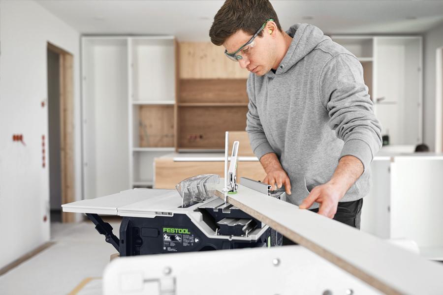 ‘Nevertheless, the table saw is still an ideal partner for the new Festool CTC SYS, CTC MINI and MIDI cordless dust extractors. Incredibly convenient and surprising versatile. The CSC SYS 50 cordless table saw is so compact that it fits into a Systainer.’