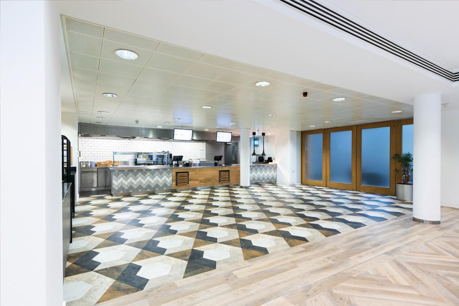 ‘The remainder of the cafeteria has been fitted with Lime Washed Oak from the Knight Tile range, with its contemporary grey-brown tones and sun-bleached driftwood effect. With an eye on the budget, standard full length planks were chosen and laid in a herringbone pattern, echoing the geometric tiles of the serving counter.