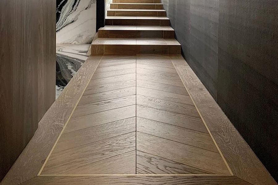 Depending on the client’s wishes chevron and herringbone can be produced in ‘left’ and ‘right’ pieces, or else with three sides groove and one (long) side tongue. ‘Of course this isn’t to forget the machinery required to create surface treatments such as brushing, distressing, band-sawing, smoking, and staining,’ says the company.