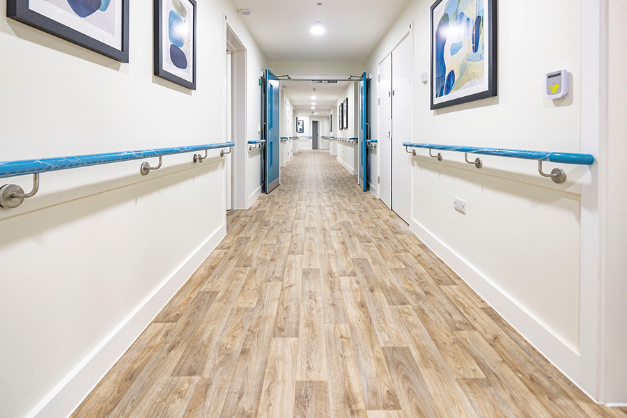Continues IVC: ‘Cornerstone Healthcare chose the warm and rustic wood plank look of Tavel T30, using the same design throughout the home for a welcoming natural look. The laying direction of the floor has been altered to help residents understand and navigate the building.’